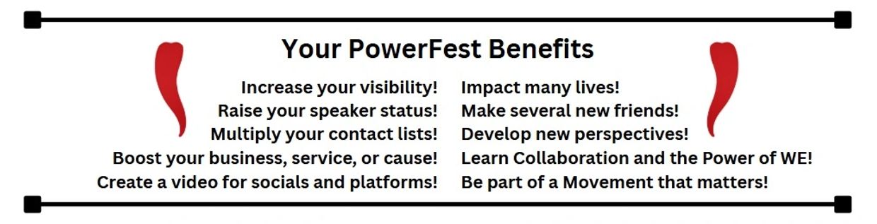 PowerFest will serve as a beacon for women seeking to unite in power, light, and purpose. Our Empowered Speakers—resilient women who are boldly living in power—will share their journeys, impart wisdom, and illuminate on the processes of building personal and professional empowerment. We will shine our light both inward and outward, celebrating our journeys and encouraging individual and collective growth.